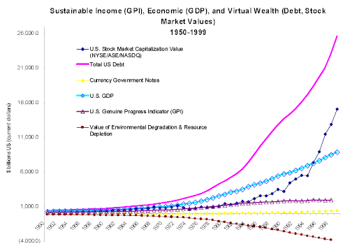 The line that starts below zero and is falling ever deeper into negative territory is a measure of the costs of the environmental degradation we heard about last night. This is a proxy for the loss of environmental services, arguably the foundation of all real wealth.