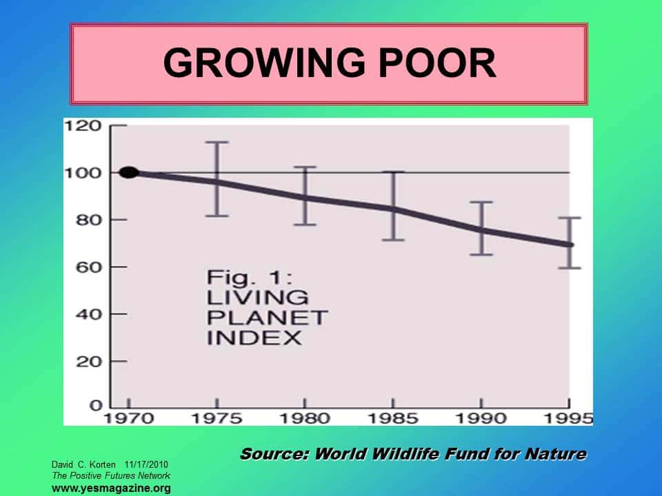 This graph presents the Living Planet Index compiled by the World Wildlife Fund for Nature to show the rate at which we are depleting the regenerative capacities, the natural wealth production, of the Earth’s forest, freshwater, and marine environments–all the things Emily Matthews was documenting. The index fell by approximately 30 per cent between 1970 and 1995. That means we have depleted 30 percent of the world’s natural regenerative wealth in one generation. Forests are shrinking, water tables are falling, soils are eroding, wetlands are disappearing, fisheries are collapsing, range lands are deteriorating, rivers are running dry, temperatures are rising, coral reefs are dying, plant and animal species are disappearing, and the climate is being more unstable. Entranced by the stock market’s illusions of wealth creation we scarcely seem to notice that we are destroying the foundations of real wealth and our very existence.