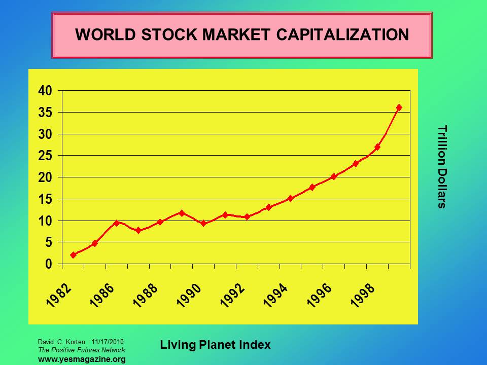 Now let’s look at a couple of graphs that show global trends. This graph shows the growth of total world stock market capitalization from $2 trillion 1982 to $28 trillion 1999. Global capitalists, those of us who live from returns to money, are doing quite well. Meanwhile, nearly half the world’s population lives on less than $2 a day and 1.3 billion people live on less than a $1 a day.
